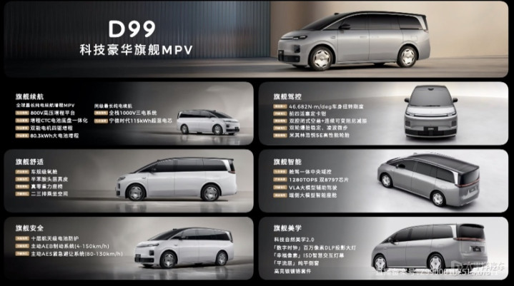 12月28日,在零跑汽车十周年发布会上,发布旗下首款MPV并命名为零跑D99,新车采用全新设计,与传统MPV造型大相径庭,颇有理想MEGA的造型风格,整车车长超5米2,轴距超3米1,提供增程和纯电动力可选,其中增程版配备80.3千瓦时电池组,纯电续航预计超500km,并配备双腔空气悬架+CDC可变阻尼悬架,预计将于2026年上市,将面向30万级豪华MPV市场。